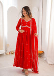Gown* • *Fabric*: Georgette • *Lining*: Soft Micro Inner • *Work*: Thred With Sequnce Work • *Flair*: *3.5 Meter* • *Stitching*: *S(36),M(38), L(40), XL(42), XXL(44)* – Ready to wear • *Lenght*: 52+ ⸻ *Pent* • *Fabric*: Havy Micro • *Fit*: Fully Stitched up to Size 44 | Elastic Waistband for Ease ⸻  *DUPATTA* • *Fabric*: Faux Georgette • *Work*: Detailed Sequin & Thread Embroidery • *Length*: 2.2 meters  Weight: Approx. 0.850 Grm
